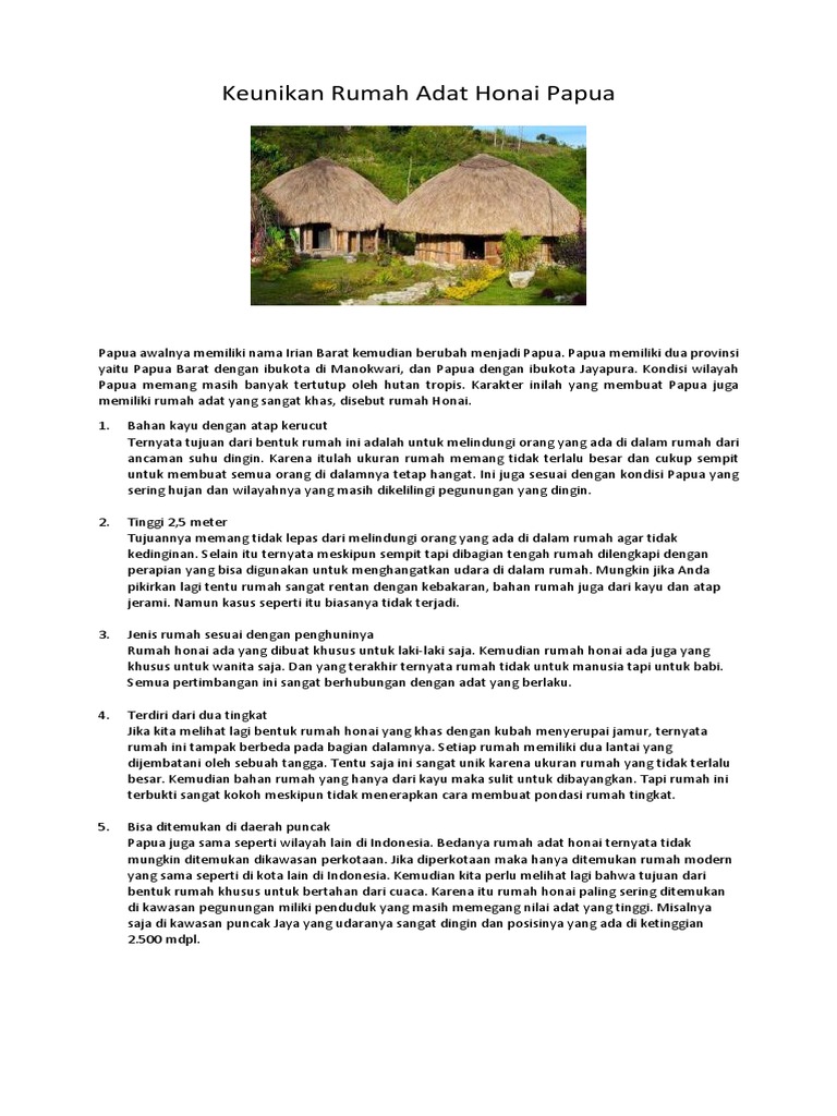 Perbedaan rumah adat mod aki aksa dengan rumah lgkojei adalah desain atapnya yang lebih modern dibanding rumah adat papua barat. Maka dari itu kita harus melestarikan dan bangga pada budaya yang ada di indonesia. Rumah adat gadang merupakan rumah adat yang berasal dari provinsi sumatera barat. Wilayah yang cukup banyak ditemukan ialah di lembah baliem atau wamena dengan suku lani yang menempatinya dan masih banyak lagi. Dikutip dari buku suku bangsa dunia dan kebudayaannya (2013) karya. Rumah honai merupakan rumah adat yang terbilang sempit dan dibuat tanpa menambahkan jendela yang berfungsi sebagai celah cahaya. Rumah adat panggung kajang leko adalah rumah adat yang berasal dari jambi, rumah ini sangat berbeda dengan rumah adat lainnya. Ciri khas rumah honai adalah bentuknya yang bundar dan beratap jerami. Di mana bentuk dasar rumah honai adalah lingkaran dengan rangka dari kayu dan berdinding anyaman serta atap kerucut yang terbuat dari jerami. Rumah ini hanya ditempat tinggali oleh raja jawa, dan bentuknya hampir miripdengan rumah adat honai, akan tetapi rumah adat ini berbentuk rumah adat panggung. Honai adalah salah rumah adat papua, tepatnya rumah adat suku dani yang bisa ditemukan di lembah dan pegunungan provinsi papua. Rumah adat honai adalah rumah yang terkenal di provinsi papua. Salah satunya adalah papua yang menjadi salah satu pulau paling besar di indonesia.